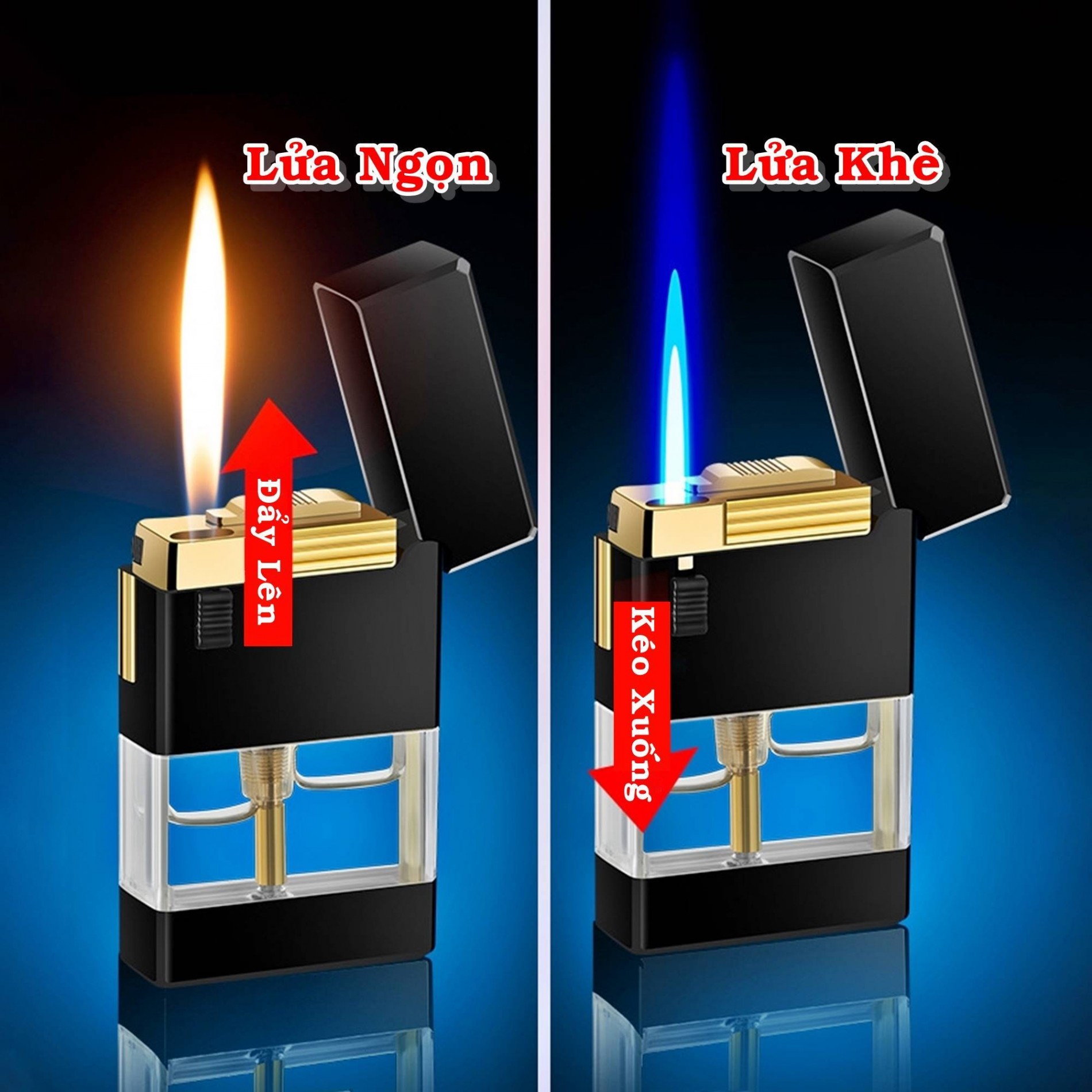- 2 chế độ lửa tiện lợi: Với hai chế độ lửa khác nhau, chiếc bật lửa này đáp ứng mọi nhu cầu của bạn. Chế độ lửa khò mạnh mẽ, ổn định, lý tưởng để châm các loại xì gà, tẩu thuốc. Chế độ lửa thường êm dịu, phù hợp cho việc châm thuốc lá thông thường.